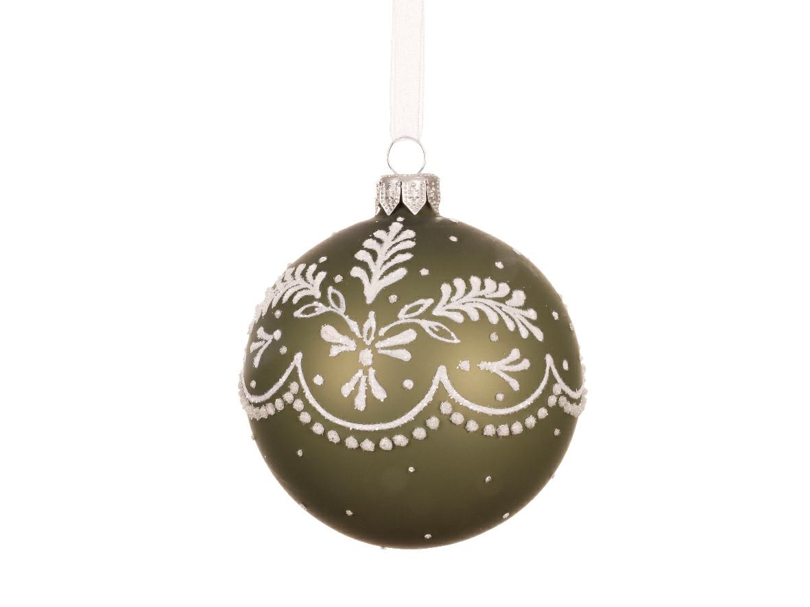 PALLINA IN VETRO VERDE OPACO CON FOGLIE BIANCHE E FIOCCHI DI NEV